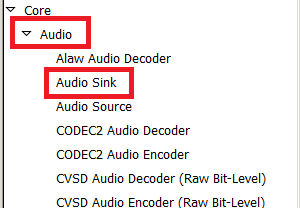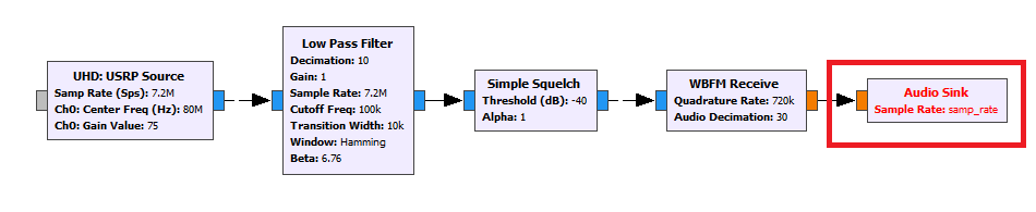 オーディオ出力のブロックを追加します.図45のように“Audio”の欄から“Audio Sink”を探します.このブロックを図46のように“WBFM Receiver”の隣に配置して配線を済ませます.