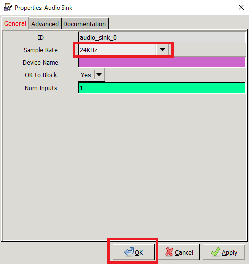 “Audio Sink”ブロックをダブル・クリックして,図47の画面を出します.“Sample Rate”の欄で“24KHz”を選択して[OK]をクリックします.