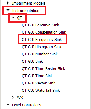 FMラジオの各部の信号の周波数スペクトルを見るために,スペアナを設置しておきます.図48のように“Instrumentation”の項目で“QT”を展開し,“QT GUI Frequency Sink”を2つ設置します.