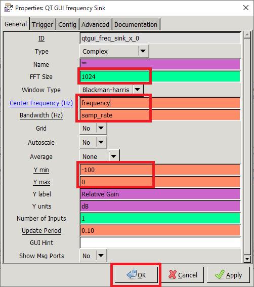1つめの“QT GUI Frequency Sink”は“USRP B205mini-i”から得られる信号を観察するために使います.ブロックをダブル・クリックして図49の画面を出し,“FFT Size”の欄に“1024”,“Center Frequency (Hz)”の欄に“frequency”,“Bandwidth (Hz)”の欄に“samp_rate”,“Y min”の欄に“-100”,“Y max”の欄に“0”を入力して[OK]をクリックします.