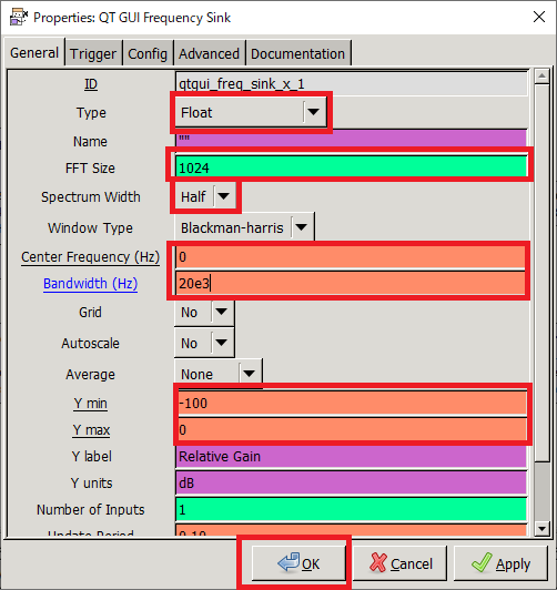 2つめの“QT GUI Frequency Sink”は復調後のオーディオ信号を観察するために使います.ブロックをダブル・クリックして,図50の画面を出します.“Type”の欄で“Float”を選択し,“FFT Size”の欄に“1024”と入力します.また,“Spectrum Width”の欄では“Half”を選択します.“Center Frequency (Hz)”の欄に“0”,“Bandwidth (Hz)”の欄に“20e3”,“Y min”の欄に“-100”,“Y max”の欄に“0”と入力して[OK]をクリックします.