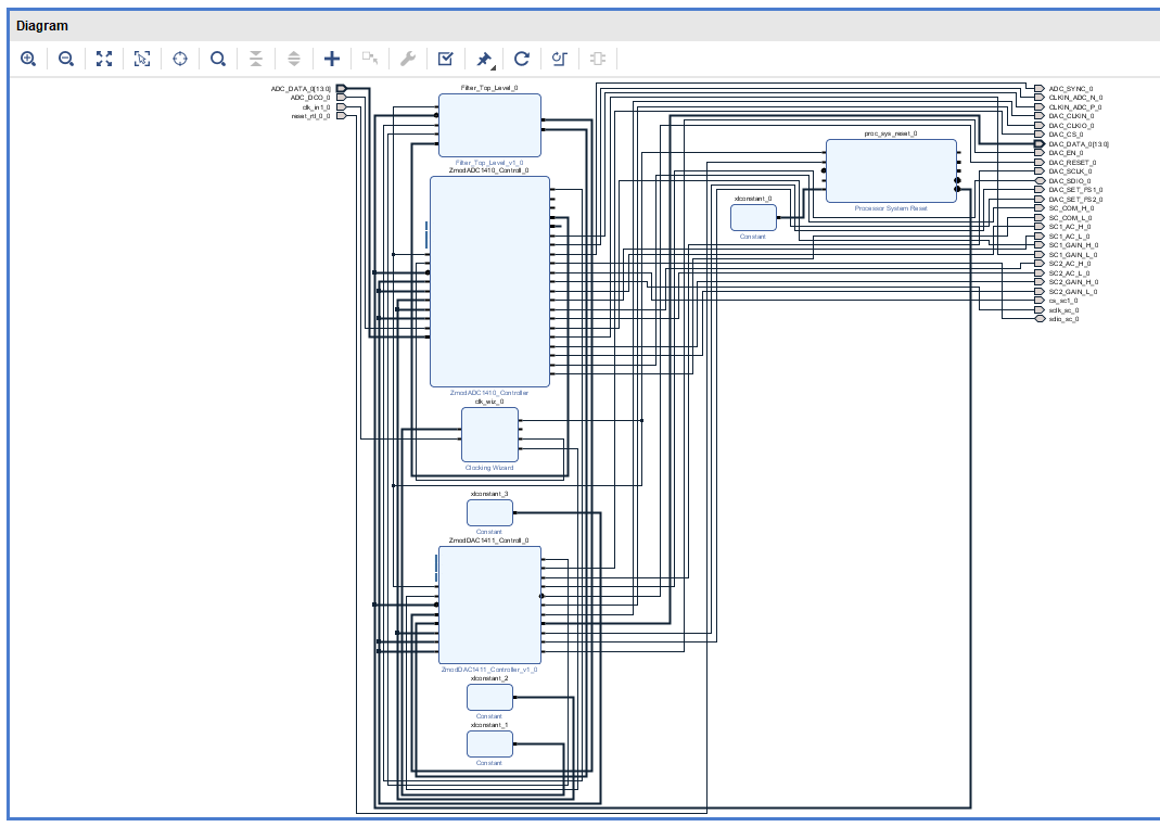 今回のサンプル・プロジェクトで定義されているローパス・フィルタのカットオフ周波数は20 kHz程度なので,低周波アナログ信号向けのシステムであると考えられます.“Zmod ADC”および“Zmod DAC”のサンプリング・レートは100 Mspsなので,これよりも桁違いに周波数が大きい信号であっても問題なく扱えます.また,入力にダウン・コンバート用のミキサを取り付ければRF帯の信号にも対応できます.