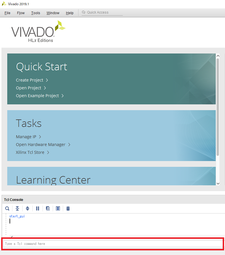 まずはVivadoを起動します.起動画面の下部に“Tcl Console”(ティクル・コンソール)という部分があるので(図21),“Type a Tcl command here”と表示されている入力欄にリスト4のTclコマンドを1行ずつ入力します.