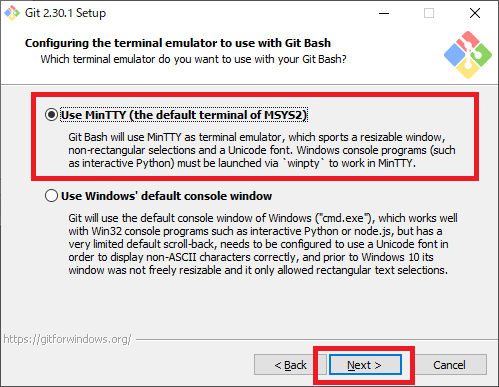 図13の画面ではターミナル・エミュレータの設定を行います.今回はデフォルトの“Use MinTTY”を選択して[Next]をクリックします.