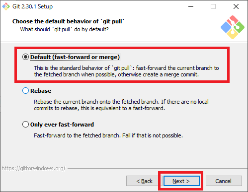 図14の画面では“git pull”コマンドの挙動について設定します.“Default”を選択して[Next]をクリックします.
