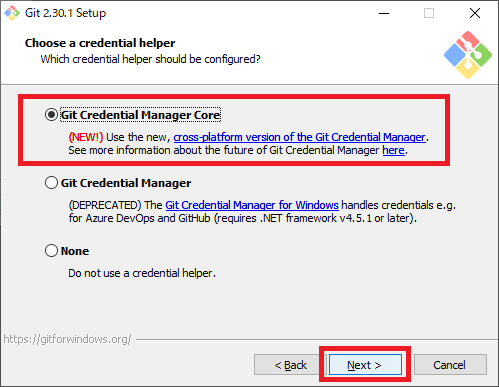 図15の画面では“credential helper”に関する設定を行います.推奨されている“Git Credential Manager Core”を選択して[Next]をクリックします.