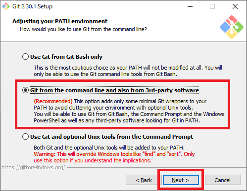 図10の画面では,環境変数の設定に関するオプションを選択します.“Git from command line and also from 3rd-party software”を選択して[Next]をクリックします.