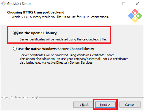 図11の画面ではHTTPS(Hypertext Transfer Protocol Secure)による接続の方式について設定します.今回は“Use the OpenSSL libarary”を選択して[Next]をクリックします.