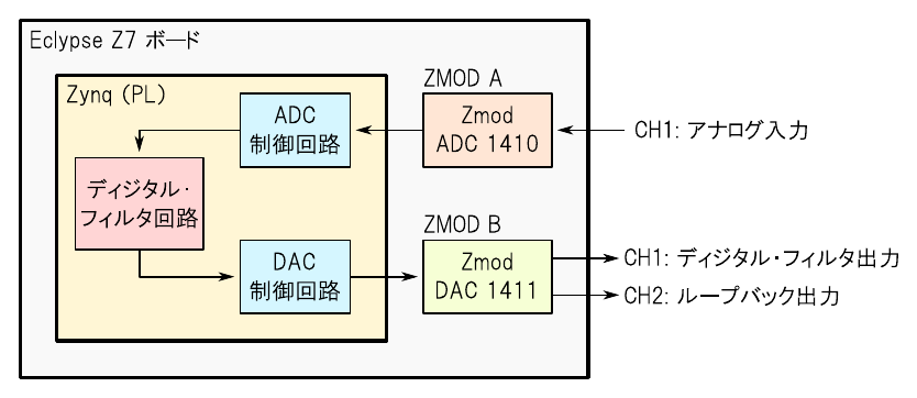 これから実験する回路の概要を図1に示します.“Zmod ADC 1410”のCH1から入力されたアナログ信号は,Zynq内部のPL部分に作りこまれたディジタル・フィルタの回路(FIR型のローパス・フィルタ)によって処理されます.演算結果は“Zmod DAC 1411”のCH1からアナログ波形として出力されます.また,比較のためにADCから取り込んだ信号をそのままDACのCH2から出力します(ループバック出力).