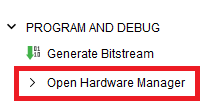 Eclypse Z7ボードをパソコンと接続した状態で,図24に示す“Open Hardware Manager”をクリックします.すると画面上部に図25のような表示が出るので,“Open target”をクリックして“Auto Connect”をクリックします.