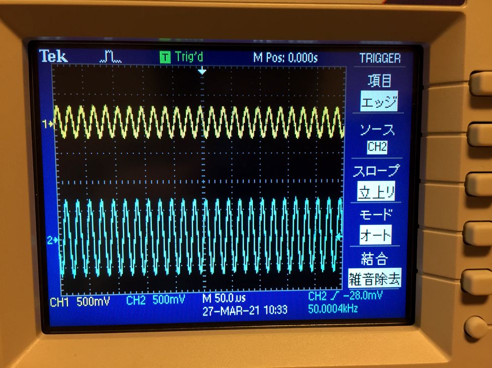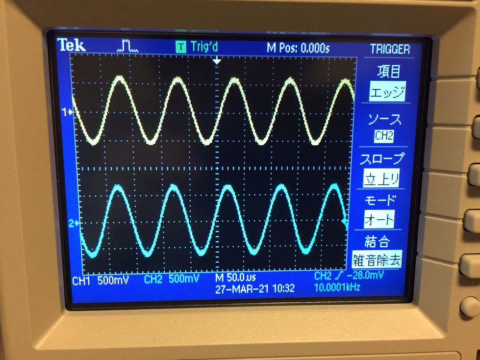 実験結果を写真8から写真11に示します.入力信号の周波数が10 kHzのときは,ローパス・フィルタの出力(CH1)とループバック出力(CH2)の振幅はほとんど同じです(写真8).