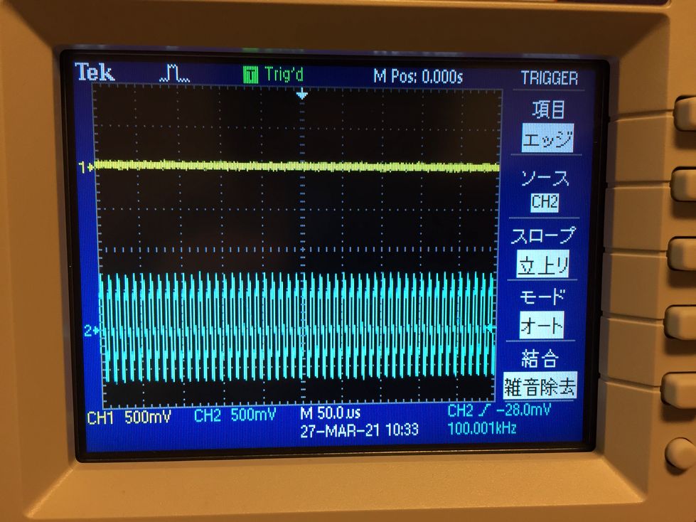 50 kHzだとさらに振幅が小さくなり(写真10),100 kHzにすると振幅はほとんどゼロになります(写真11).このことから,問題なくローパス・フィルタとして機能していることが確認できます.