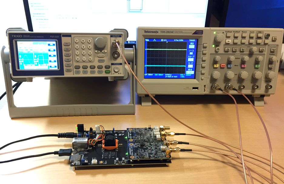 今回は写真7のような測定系で実験を行います.ファンクション・ジェネレータの出力は“Zmod ADC”のCH1に接続します.出力波形はsin波,オフセットは0 V,振幅は500 mVppとしました.