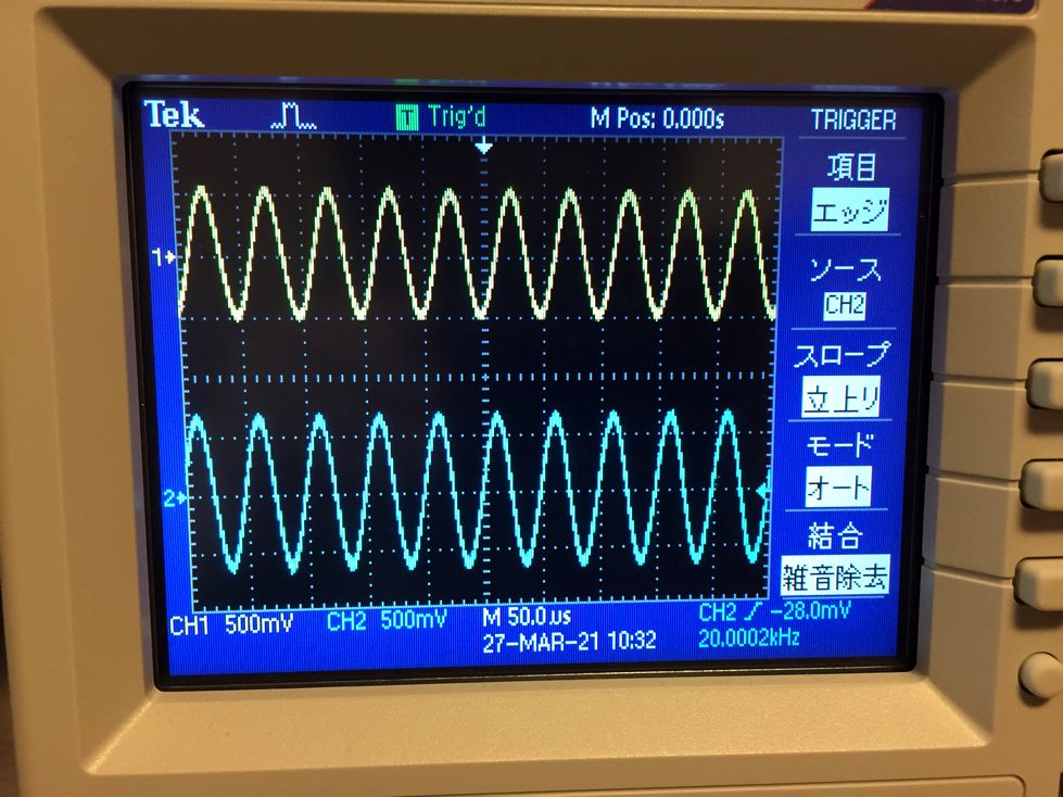 周波数を20 kHzにすると少しだけローパス・フィルタの出力(CH1)の振幅が小さくなります(写真9).