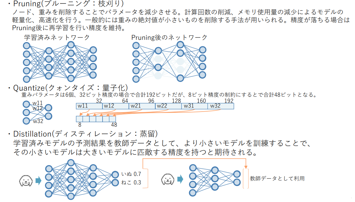 - Pruning(プルーニング):不要なノードや重みを削除することで,モデルのサイズを縮小し,計算負荷を軽減します.