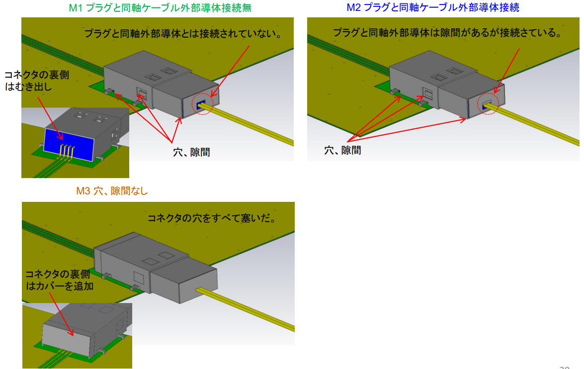 シールド付きコネクタの効果を確認するため,M1, M2, M3という3つのモデルを用いたシミュレーションを実施しました.M1はシールド接続なし,M2は部分的な接続,M3は完全なシールド接続のモデルです.結果として,同相信号の場合,M3でもっともノイズが少なくなることが確認されました.一方,差動信号では,シールドの隙間が多少あっても放射ノイズには大きな影響はありませんでした.