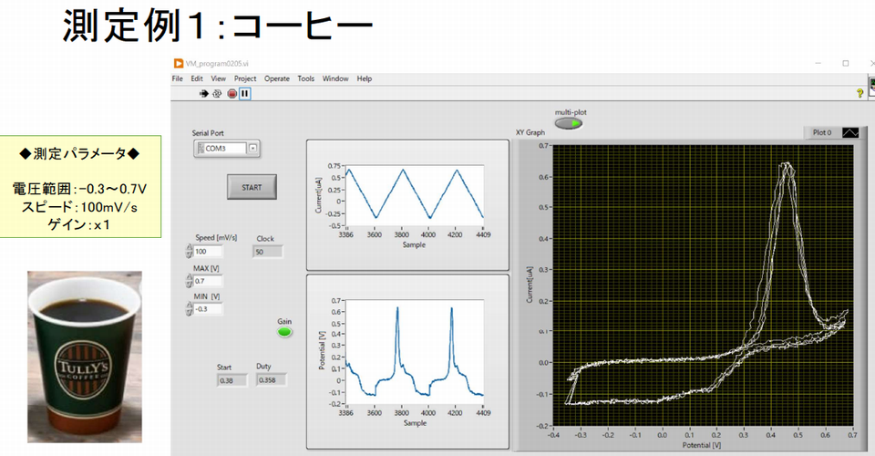 | 図1 計測制御ソフトウェア LabVIEWとビギナ向けマイコン・ボード Arduinoを組み合わせて,珈琲に三角波電圧を印加し,その電流応答を分析するボルタンメトリを制作.[著・提供]田口 海詩.画像クリックで動画を見る.または記事を読む.詳細は[VOD/KIT]LabVIEW×Arduino!初めてのパソコン計測&制御 |