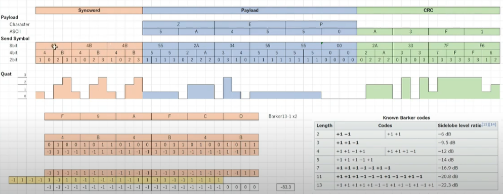 Barker Codeを使用する場合,信号のビット列は例えば`+1,-1,+1,+1,-1`のように符号反転を伴って処理されます.この符号変換によって,相関演算でのピーク検出が強調されます.具体的には,受信側で受信信号とSyncWordの畳み込み演算を行い,得られる値が最大になった位置をもとに同期を確立します.