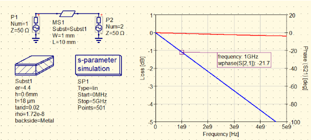 QucsStudioのマイクロストリップ線路シミュレーションを用いると,伝送線路を通過する信号の位相変化から波長$λ_g$を求められます.プリント・パターンの長さ$L = 1$cmの場合,位相変化から計算すると$λ_g = 16.59$cmとなり,自由空間の波長に比べて短くなっています.この比率は波長短縮率$k$と呼ばれ,$k = λ_g /λ_0 = 0.553$になります.つまり,FR-4基板上のマイクロストリップ線路では信号の波長は自由空間の約55%です.