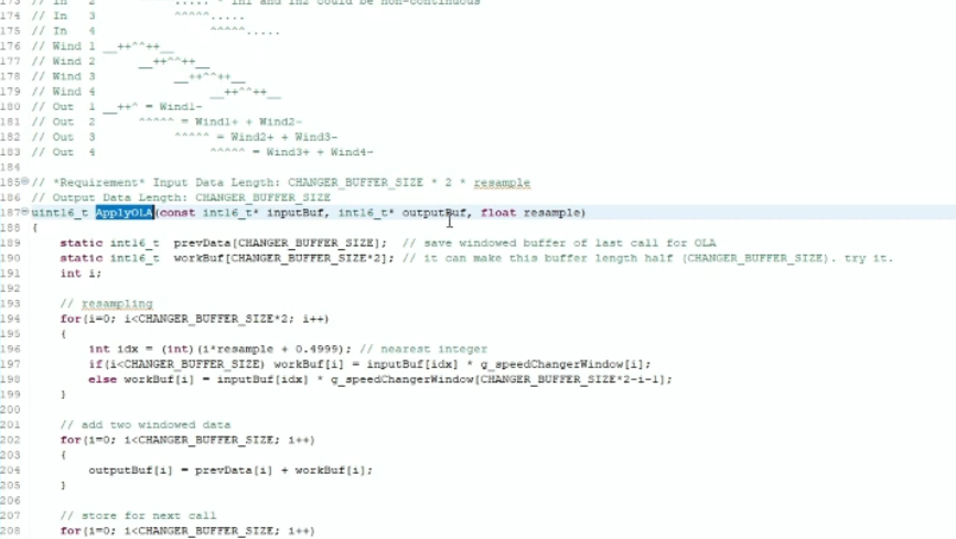 データ転送時に速度を変える処理では,重複加算法(Overlap-Add,OLA)が使われます.この手法では,オーバーラップする部分を緩やかに足し合わせることで,不連続な音の切り替わりを滑らかにします.再生速度を速めたり遅くしたりする際,単純にバッファ内のサンプル数を変化させると音の途切れが発生する可能性があるため,OLAが有効です.