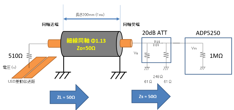 最大サンプリング・レート1GSPSのADP5250は,USB2.0通信速度480MSPSの波形を正確に記録できます.同軸線路内の誘電体特性に基づき,CH-1とCH-2間の遅延差は20mm以下に抑える必要があります.