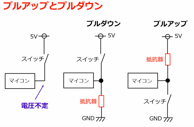 このように,スイッチが押されていないとき(OFF)はピンがHIGH(5V)を維持し,押されたとき(ON)にグラウンドへ接続されてLOW(0V)になります.この方法により,回路の電圧が不定になる問題を防ぎます.