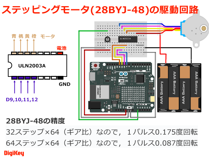 ギアを内蔵するステッピング・モータ(28BYJ-48など)を使うと,出力軸の1回転あたりに必要なパルス数が増えるため,より細かい角度で制御できます.
