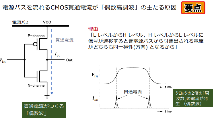 クロック周波数の偶数次高調波が奇数次よりも強く現れる場合,電源バスを流れるCMOS貫通電流が主な原因です.