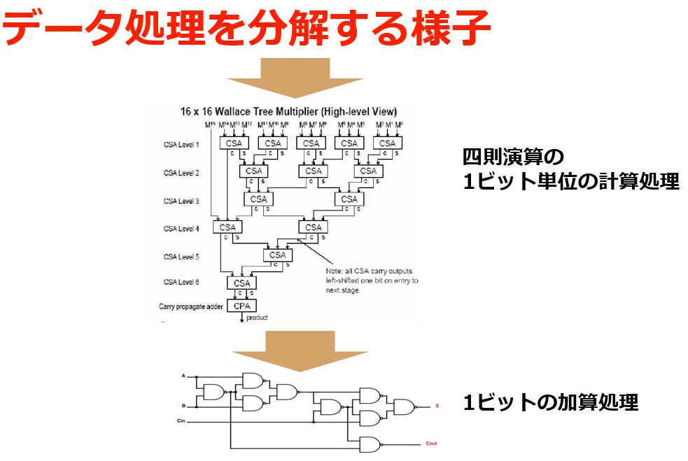 CPUは$\cos$や$\sin$のような複雑な数式を,四則演算に分解することで計算可能にしています.さらに四則演算を加算の組み合わせに分解し,加算は1ビットごとの処理に変換されます.