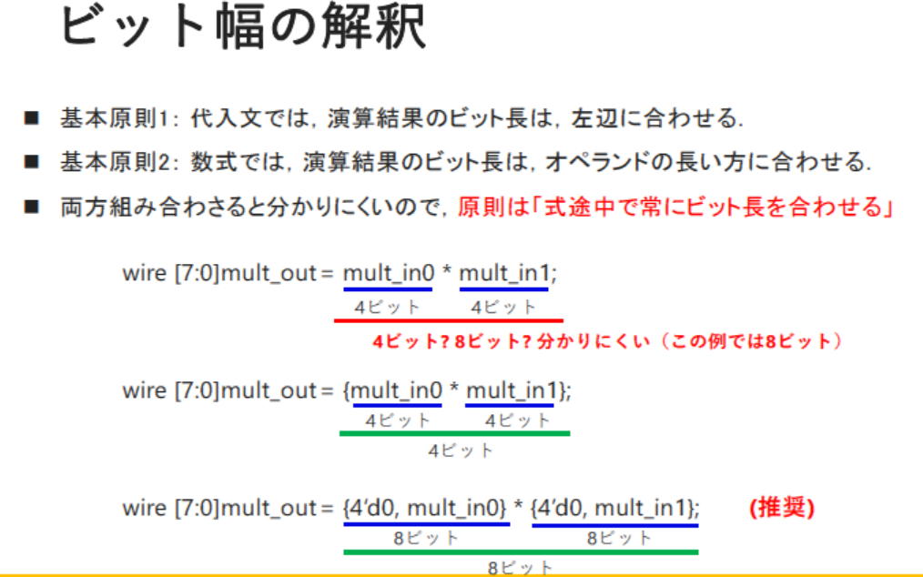 1. 代入文では,演算結果のビット長は左辺に合わせる.`wire [7:0] mult_out`に代入される場合,演算結果が8ビットに切り詰められます