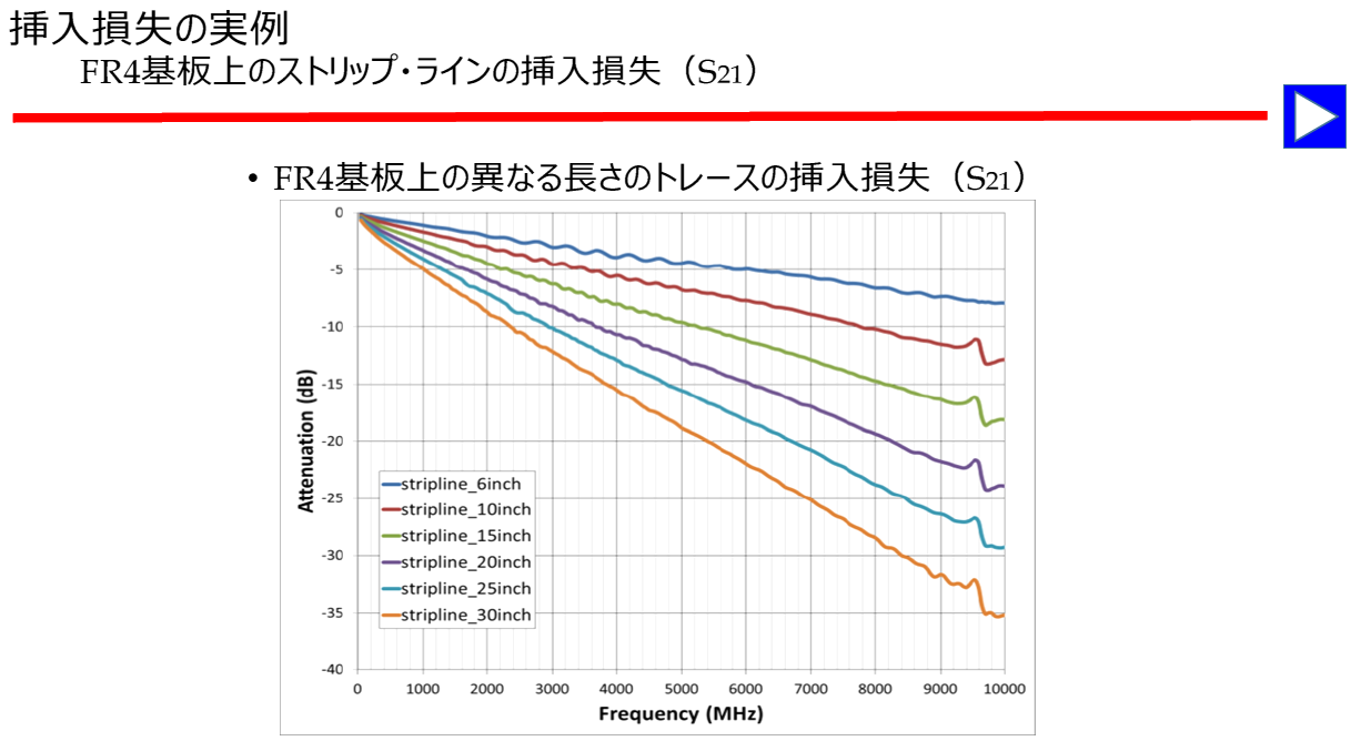 たとえば,ストリップ線路上で6インチ(約15cm)の伝送路を通した場合の損失を比較した測定では,周波数が上昇するとともに挿入損失が急激に増加する傾向が示されました.