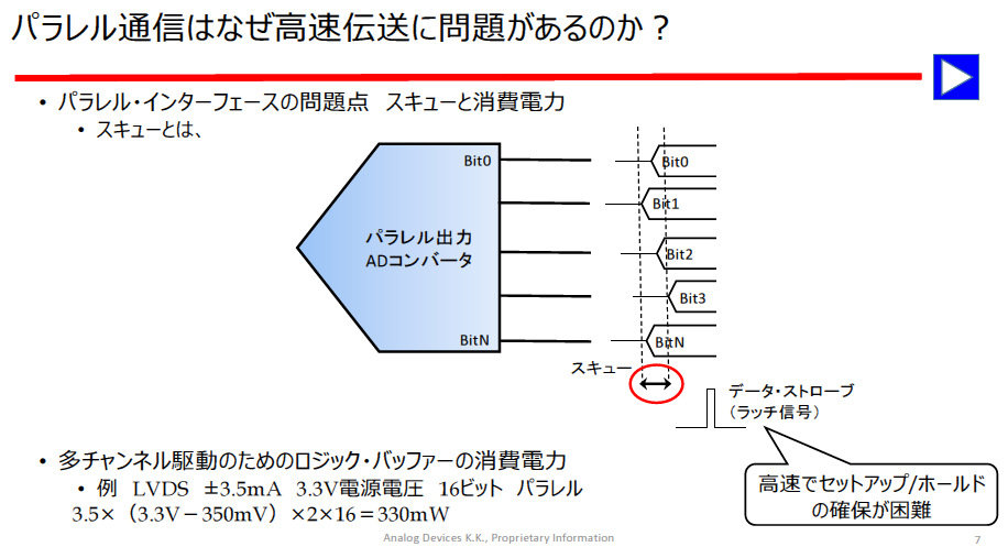 A-Dコンバータの高速化に伴い,パラレル伝送方式はスキューや電力,物理配線の制約から限界に直面しています.