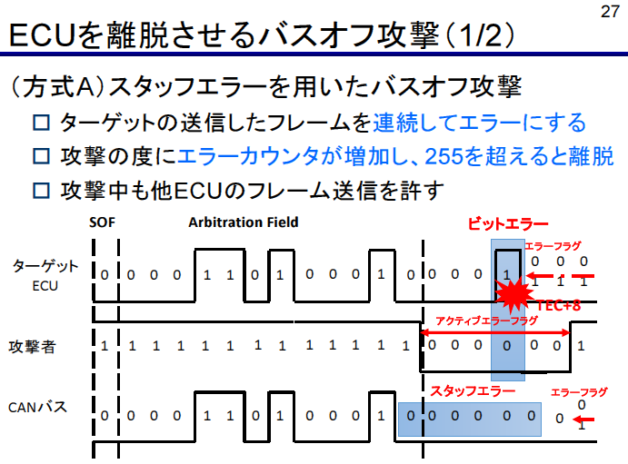- スタッフ・エラー方式:ターゲットECUの送信フレームを連続してエラー化し,TECを255以上にしてバスオフ状態にする.攻撃中も他ECUのフレーム送信を許す