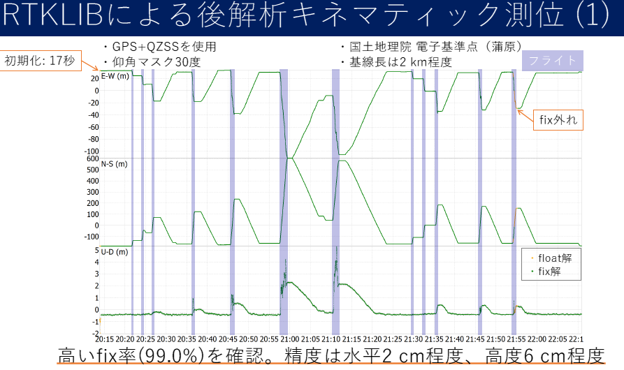 また,Fix解からfloat解に変化した場合,その位置精度は大きく劣化します.したがって,後解析においてはFix率が99%以上であることがデータ品質の判断基準になります.特に遠隔地での観測や長時間の記録において,このFix率は最終成果物の信頼性を大きく左右します.