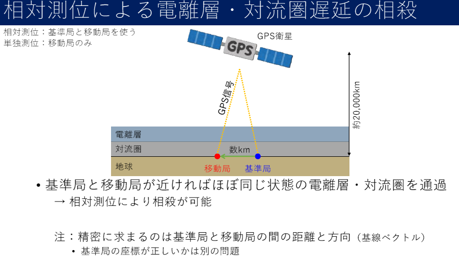 GNSS衛星から発信される信号には,さまざまな誤差成分が含まれます.たとえば衛星や受信機の時計のずれ,衛星軌道の不正確さ,大気中の電波遅延などです.相対測位では,これらの誤差が両局で共通であると仮定し,差分を取ることでこれらの誤差を除去します.