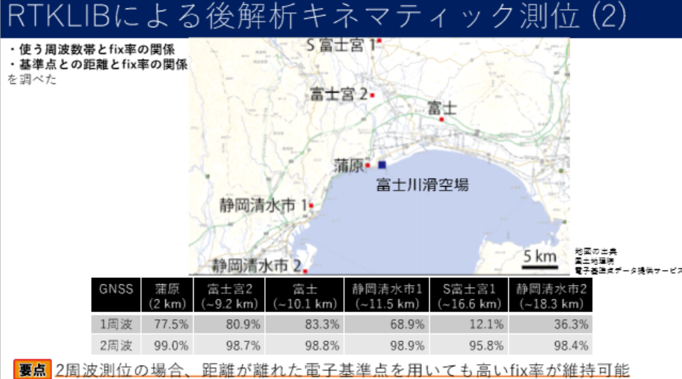 図1 後処理キネマティック解析では,2周波GNSSを用いることで,遠方にある基準局との間でも高いFIX率を維持できる.画像クリックで動画を見る.または記事を読む.[提供・著]樋田 啓