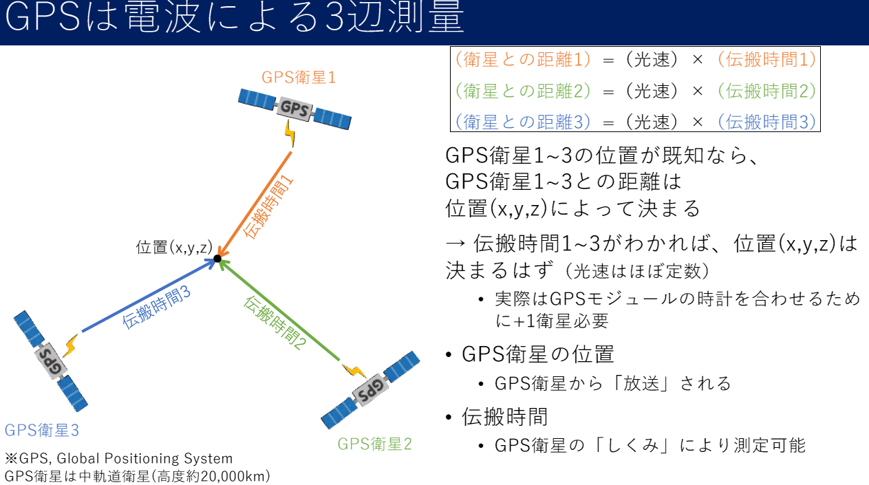 GPS衛星は高度約20000 kmの中軌道を周回しており,常時複数の衛星が地上と通信可能な状態にあります.ただし,受信機の内部時計は精度が限られているため,正確な時刻合わせのために4つ目の衛星による補正が必要です.このため,測位には最低4基の衛星が必要です.