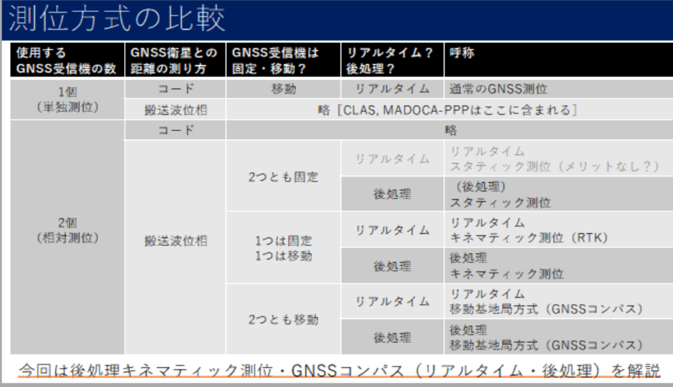 - 後処理キネマティック測位:RTKと同様の構成で後処理を行う方式