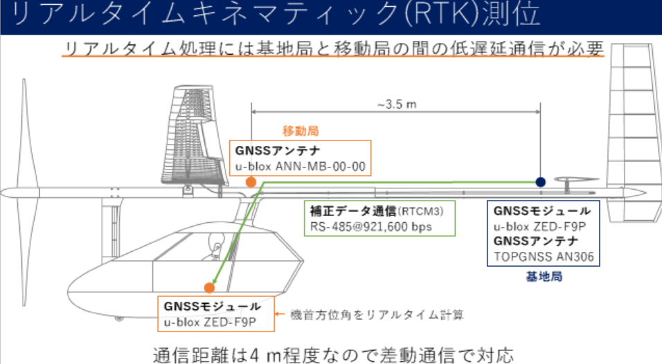 高精度GNSSコンパスを飛行機に実装する際,リアルタイムに機首方位角を取得するためには,移動局と基地局の間で低遅延かつ安定した通信が不可欠です.今回の実験では,機体の後方に設置した基地局から,前方の移動局へRS-485通信(921600 bps)で情報を送信し,移動局側で機首方位角のリアルタイム計算を行いました.