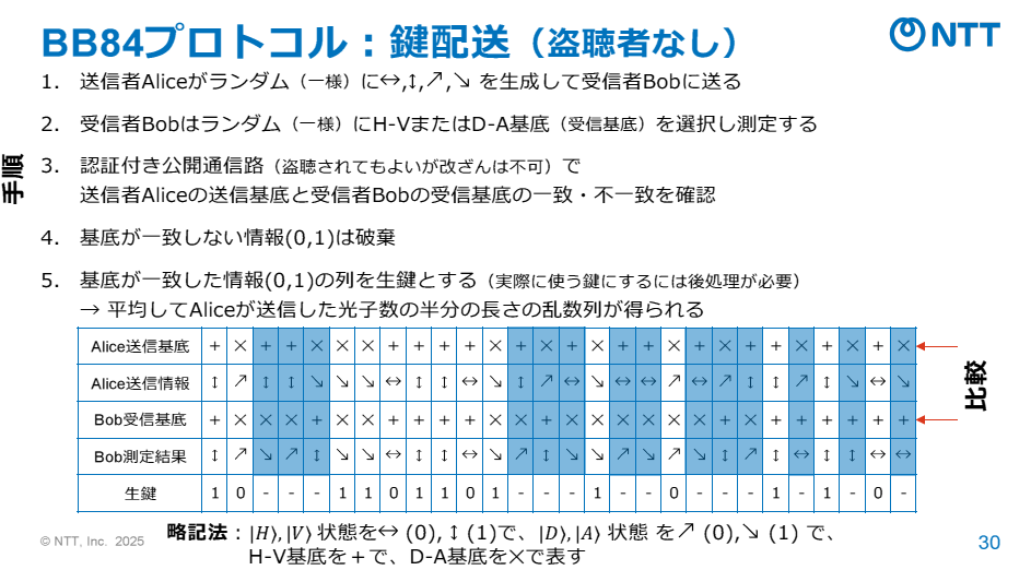 この過程において,もし第三者が盗聴を試みれば,量子状態に対する測定の影響により必ず痕跡が残ります.したがって,盗聴の存在を検出することが可能です.平均するとAliceが送信した光子数の半分程度が生鍵として利用可能であり,通信路の安全性が保証されます.