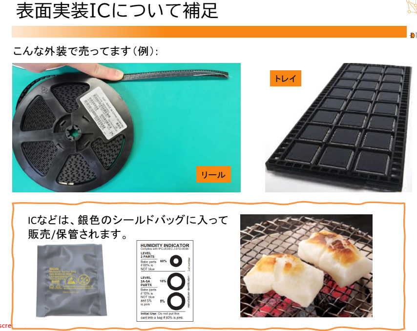 表面実装ICはリールやトレイ,シールド・バッグなどに梱包されます.銀色のシールド・バッグは湿度を防止するパッケージで,ICの品質維持に重要です.パッケージ内には乾燥剤が同梱され,水分吸収を行います.これによりIC内部に水分が残ることを防ぎ,リフロ時の膨張やパッケージ破損を抑制します.