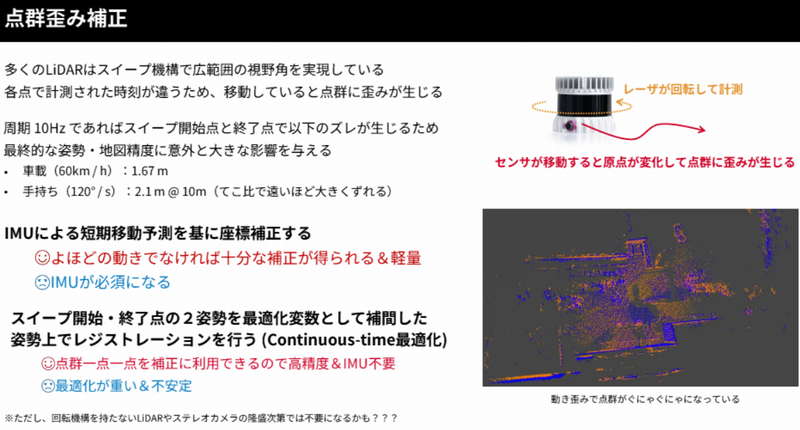 図1 LiDARの計測原理に起因する「点群の歪み補正」が,SLAMの位置精度の鍵を握る.画像クリックで動画を見る.または記事を読む.[講師]小出健司