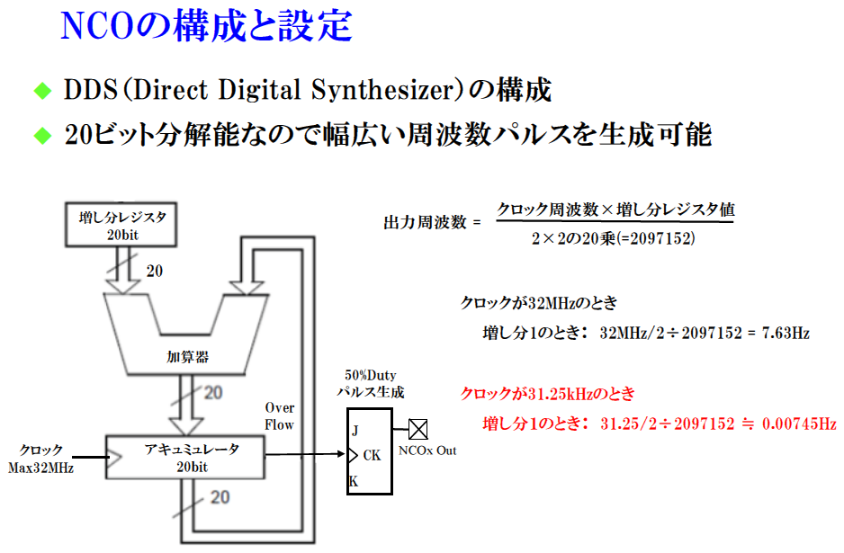 NCO(Numerically Controlled Oscillator)は,DDS(Direct Digital Synthesizer)の原理を利用し,クロック信号を基に任意の周波数の矩形波を生成する回路です.PIC16F17146は,20ビットのアキュムレータとインクリメント・レジスタをもち,幅広い周波数に対応可能です.