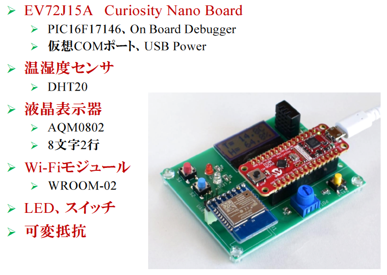 ミニIoT製作キット z-piciot-miniは,8bit PICマイコンであるPIC16F17146を中心に構成され,Wi-Fiモジュールや温湿度センサ,液晶表示器などの周辺デバイスを備えています.各コンポーネントの主な仕様は以下のとおりです.