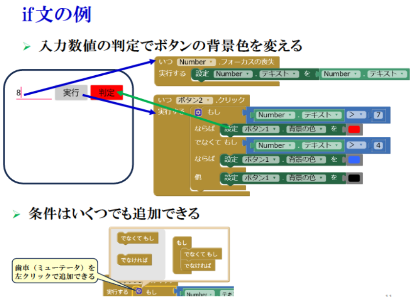 アプリ内でユーザが入力した数値によってボタンの色を変える場合,if文を使って条件を判定します.変数$Num$にテキスト・ボックスの値を代入し,条件によって背景色を変更します.
