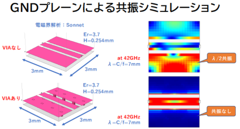 基板を貫通する導体「ビア」が不適切に配置されると共振が発生し,特定の周波数帯域で特性が劣化します.mmConは,0.4mm間隔でビアを設けることで,電磁波の均一な伝播を実現しています.〈著:ZEPマガジン〉