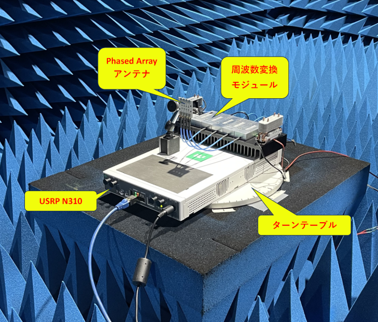 MATLABで生成したI/Qデータは,USB SDR USRP N310を通じて2.2GHzのベースバンド信号へ変換されます.USRP N310はリアルタイムで4チャネルのI/Q信号を28GHz帯までアップコンバートし,フェーズドアレイ技術により複数の方向にビームを同時に送信します.
