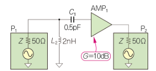 増幅器(AMP1)のゲイン特性を測定した結果,5GHzにおいてゲインが低下していることが判明しました.これを改善するために,AMP1の入力に直列で0.7pFのキャパシタを追加します.通常の低周波回路の考え方では,小容量のキャパシタを直列に追加すると高域でゲインが低下するはずですが,高周波回路では逆にゲインが増加することがあります.