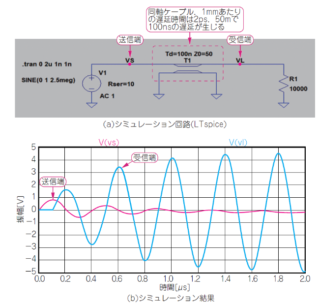 反射が起きると,信号の波形に変化が生じます.送信端が50$\Omega$,受信端が開放された場合,伝送線路の特性インピーダンスと一致しないため,反射が発生します.このとき,送信端で送られた信号が反射して戻り,入力信号と合成されることで波形が変化し,最終的に1Vに収束します.低速のディジタル回路では,反射の影響は目立ちませんが,波形が急激に変化しないため,波長が大きくなると反射の影響が顕著に現れます.