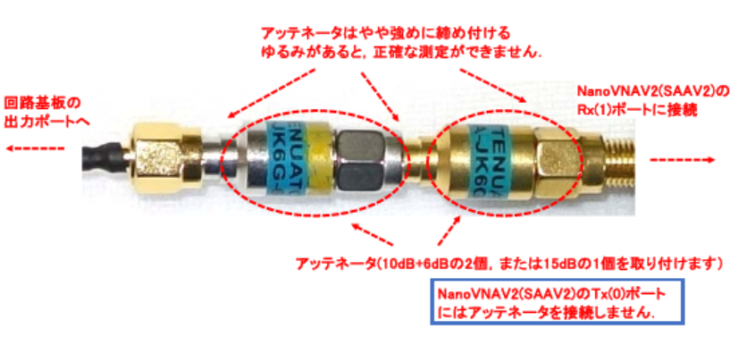 SMAコネクタは非常に精巧な部品であり,そのゆるみや損傷は測定結果に大きな影響を与えます.アッテネータ(10dB+6dBまたは15dB)の接続では,Rx(1)ポートにしっかりと装着し,ゆるみがないことを確認してください.Tx(0)ポートにはアッテネータを接続しない仕様です.このような接続条件を守ることが正確な測定の鍵です.